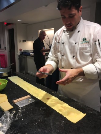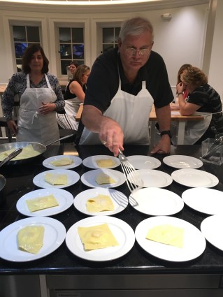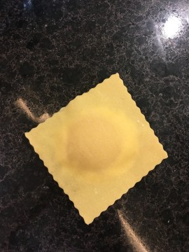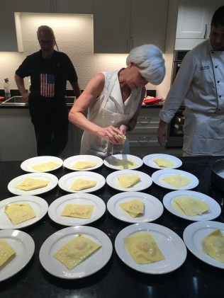 I cut these ones into squares using a pastry roller, but I have normally done them with a large round cookie cutter, either way works. The idea here is that the sauce is now inside of the pasta, so we simply toss the cooked pasta (place carefully in boiling water for 30-45 seconds) in butter and serve. When you cut into the raviolo, the yolk spills out and mixes with the ricotta cheese to make the sauce. We then plated each one for the class to try, luckily I had some good helpers with me.